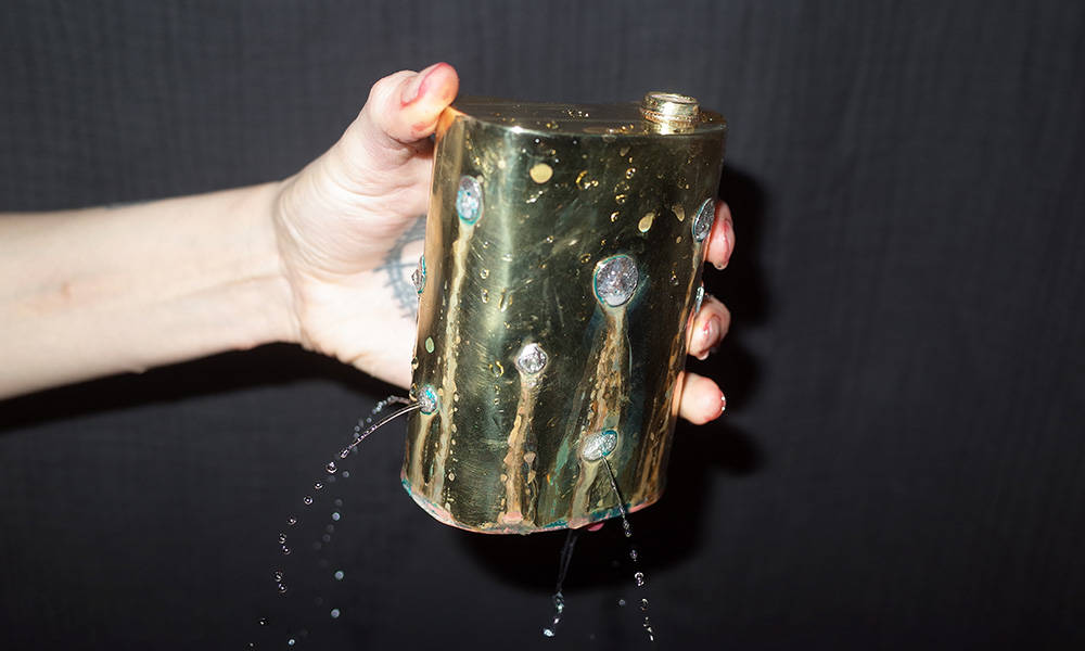 I samband med detta behövde hon stöd för att skaffa nödvändigt verktyg för sin utbildning vid Konstfack. Här kan du betrakta Wildas intagningsarbete som föreställer en plunta med avtryck av hennes egna eksem som läcker ut dess innehåll.
