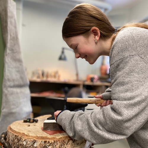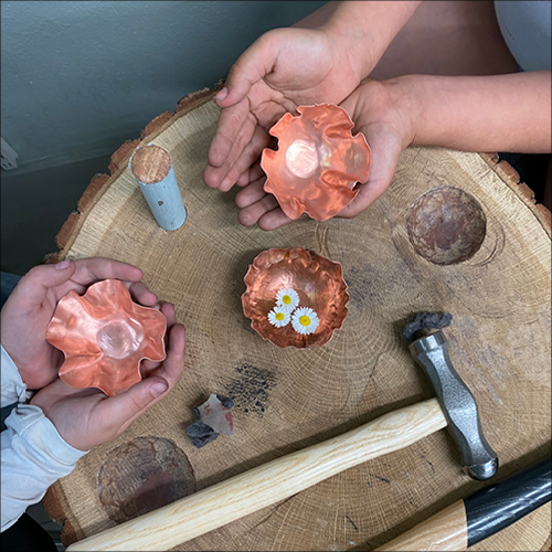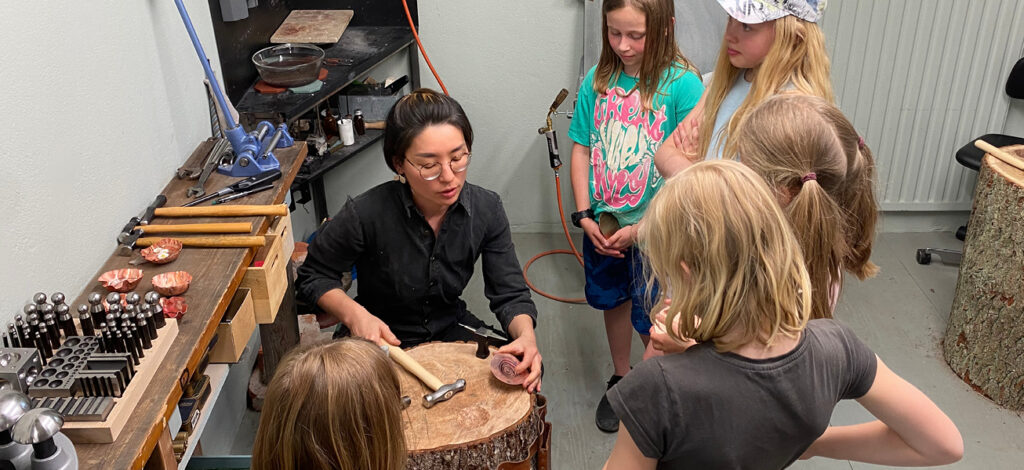 Vår absolut största drivkraft med utvecklingen av Smedjan Blackeberg, som har vuxit de två första åren av ren inspiration, är alla möten och glädjen vi får av de barn och vuxna som kommer till oss i våra kurser. Att undervisa ett hantverk med den kvalitet, de verktyg och i den miljön vi får göra är ren glädje. Barnen behöver det och för oss känns det mycket meningsfullt. I dag erbjuder Smedjan Blackeberg 5-veckors barnkurser i silversmide, två per termin som riktar sig till barn i mellan -och högstadieåldern. Barnen återkommer alltså fem gånger, 1,5 timma per gång i grupper om 6 deltagare och två handledare. Flera av barnen i våra kurser har också blivit återkommande deltagare.